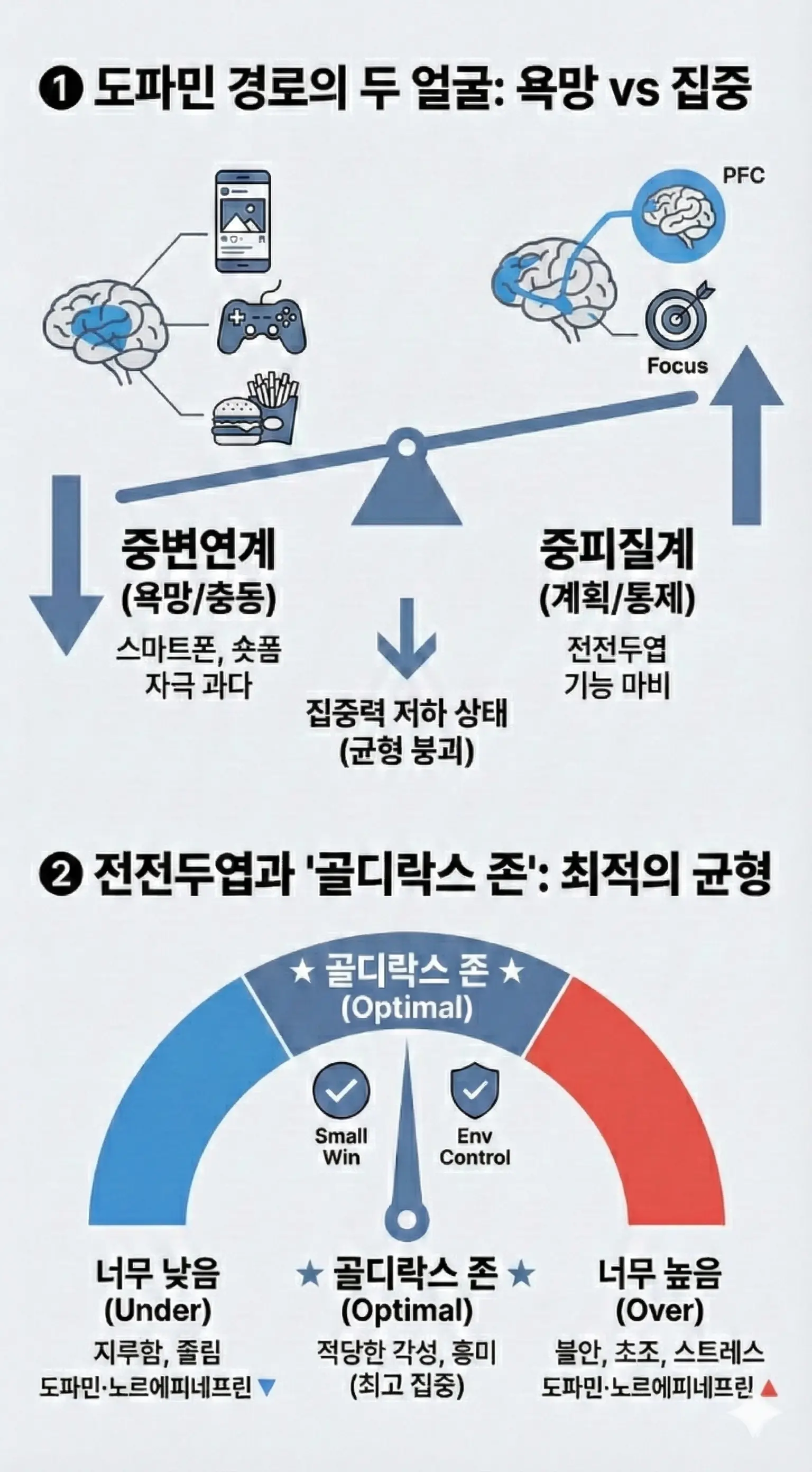 집중력의 사령탑인 전전두엽(PFC)은 도파민과 노르에피네프린 수치가 너무 낮으면(지루함, 졸림) 작동하지 않고, 너무 높아도(불안, 초조, 스트레스) 먹통이 됩니다. 우리가 추구해야 할 것은 적당한 각성과 흥미가 유지되는 '골디락스 존(Goldilocks Zone)'입니다. 앞서 언급한 '작은 승리(도파민 상승)'와 '환경 통제(스트레스 감소)'가 바로 이 균형을 맞추는 핵심 조절 장치입니다.