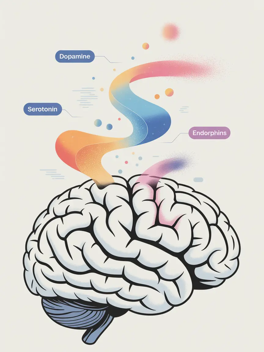 작동 원리: 엔도르핀은 과제 수행 중 발생하는 미세한 피로감을 줄여주어 몰입을 쾌감으로 느끼게 하고, 세로토닌은 감정을 안정시켜 평온하고 집중된 상태를 유지하게 돕습니다.